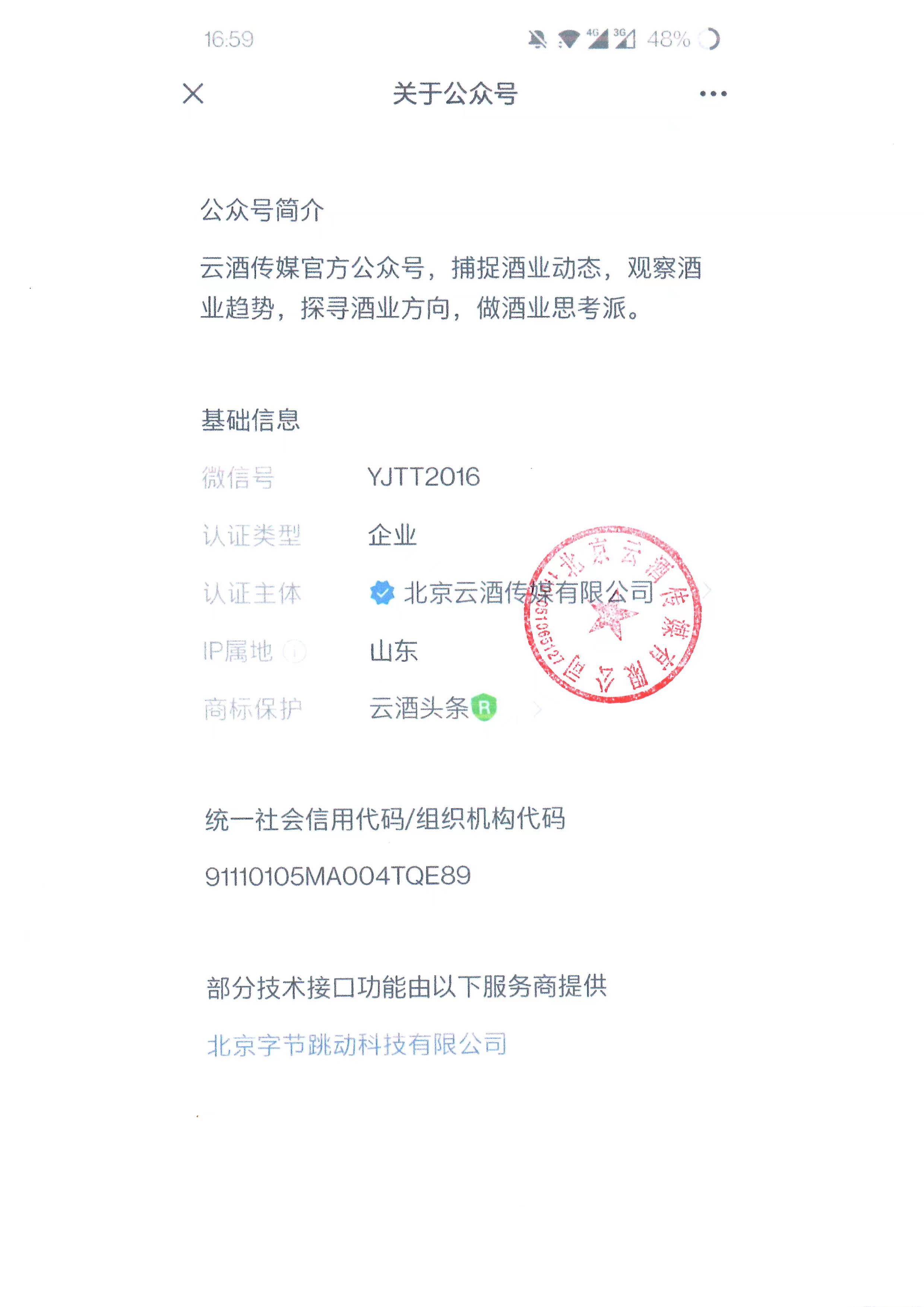 根据北京云酒传媒有限公司出具的说明,云酒头条(微信号:YJTT2016)为北京云酒传媒有限公司所属、所办的新媒体,“云酒头条”微信公众号认证主体为北京云酒传媒有限公司。