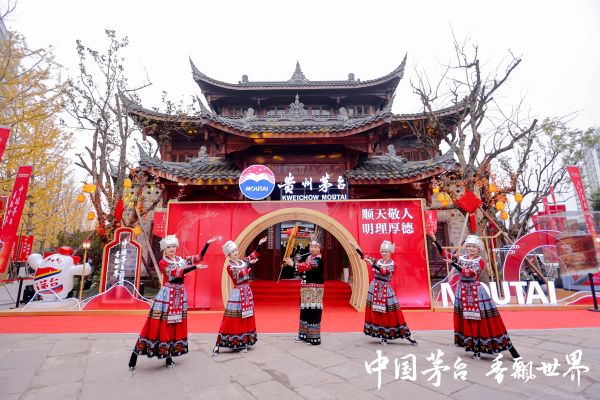 茅台展厅位于冠英古街,整体采用茅台红为主色调,营造出庄重而热烈的氛围。展厅大门以优雅的拱形设计呈现,门头上,左侧雕刻着栩栩如生的飞天女神像,象征着茅台的悠久历史与文化传承;右侧则镌刻着“顺天敬人 明理厚德”的核心价值观,彰显企业精神。大门两侧巧妙融入了小茅形象与“MOUTAI”字样等元素,将茅台的传统韵味与国际化视野相结合,传递茅台迈向世界的坚定信念。