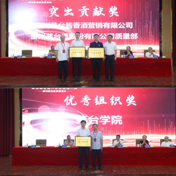 大赛还对在“2024全国大学生白酒品酒大赛贵州省选拔赛”中作出重要贡献的单位和优秀指导老师进行了表彰,其中,茅台酱香酒公司、茅台酒股份公司质量部荣获“突出贡献奖”称号,茅台学院荣获“优秀组织奖”称号。