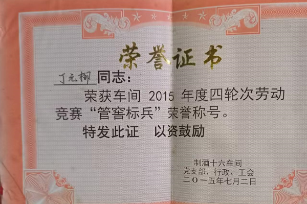 温度监测与数据记录是管窖的关键环节。从入窖到开窖的数十天里,丁元柳每日定时检测窖内温度变化,详实记录各项数据,为酿造过程提供可靠依据。这份工作不分寒暑、无论假日,他始终如一地坚守。当被问及为何如此“较真”,他语气朴实:“刚开始的时候,有人劝我,管窖嘛,差不多就行,没必要这么较真,但我认为既然干了这份活,就得担起这份责任,对得起自己的良心,对得起公司的信任。”正是这份对工作的敬畏心、对品质的执着心,让丁元柳在管窖岗位上一干就是数十年,从未出现过一次工作差错,用坚守筑牢了生产一线的“根基”。